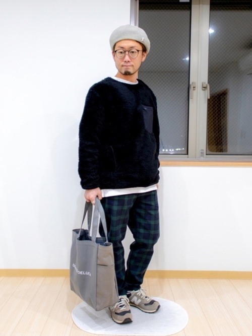 ブラックのプルオーバーフリースが主役のメンズコーデです。黒はカラーが強いため全部同じカラーでまとめてしまうとダサ見えの可能性も。こちらのコーデではインナーの白を裾から見せたり、首元に抜け感を作っておしゃれな雰囲気にまとめています。帽子、バッグ、靴のカラーを合わせているのがおしゃれです。帽子はニット帽だとカジュアルにまとまります。
