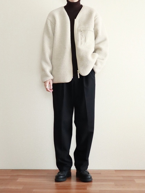 アウトドアアイテムのフリースもトレンドのノーカラーのものを選べば一気に街着としておしゃれな雰囲気に。こちらはモノトーンでまとめたメンズコーデです。インナーにきれいめタートルを選んで大人っぽく仕上げているのが特徴。パンツもスラックスできれいめにまとめました。インナーはニット素材でほっこりした印象に。