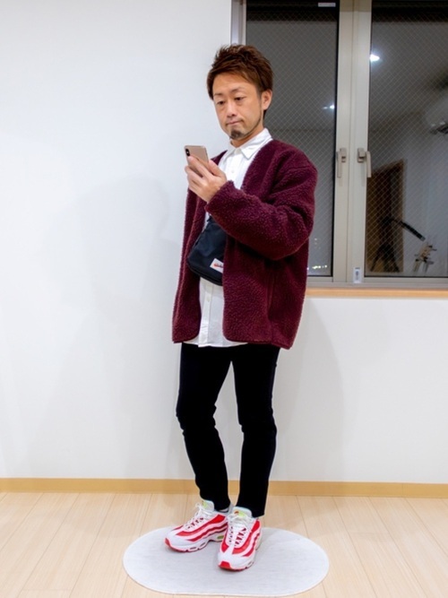 ノーカラーのフリースにドレスシャツをあわせたメンズコーデです。足下がスニーカーでフリースもボルドーですが、どこかおしゃれで洗練された印象を受けるのはシャツと黒のパンツのおかげ。街中でもおしゃれに見えるコーデでしょう。