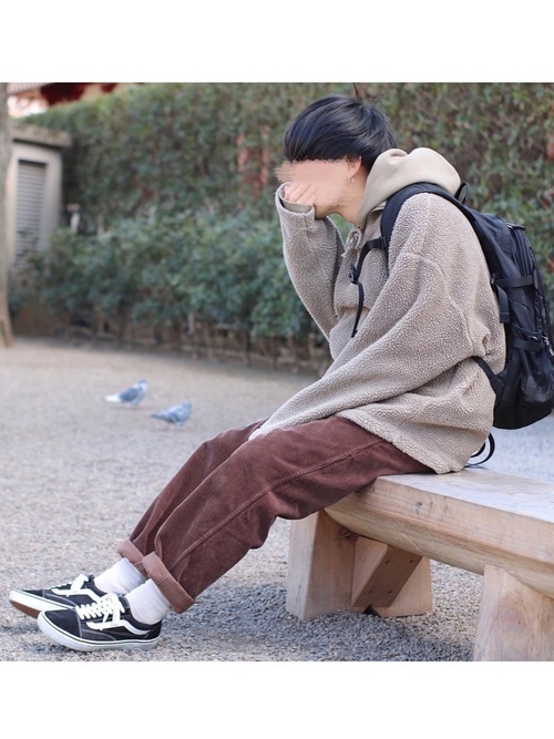 こちらは柔らかい印象のブラウンやベージュで作り上げたメンズコーデです。トップスのフリースがビッグシルエットなので暖かい雰囲気かつトレンド感ある印象に。ぼやけがちなカラーを選んでいるので、リュックや靴にブラックを取り入れてコーデを引き締めています。インナーはパーカーですがニットをもってくるのもおすすめ。