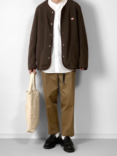 人気のバンドカラーシャツ×フリースのメンズコーデです。カラーにブラウンを使用することで暖かみがある印象に。靴にブラックをもってくることで引き締め効果を狙っています。寒い時はシャツの上にニットベストをプラスしても。優しい印象なのでカフェデートにもおすすめのコーデで、女子ウケも狙えるでしょう。
