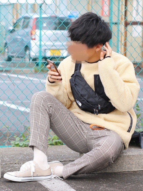 こちらは柔らかい色合いのアイテムでまとめたメンズコーデです。プルオーバータイプのフリースが全体的に暖かい印象を作り出しています。ウエストバックを斜めがけして黒のラインを作ることで白を基調としたぼやけがちなカラーコーデを一気に引き締めたおしゃれなコーデでしょう。