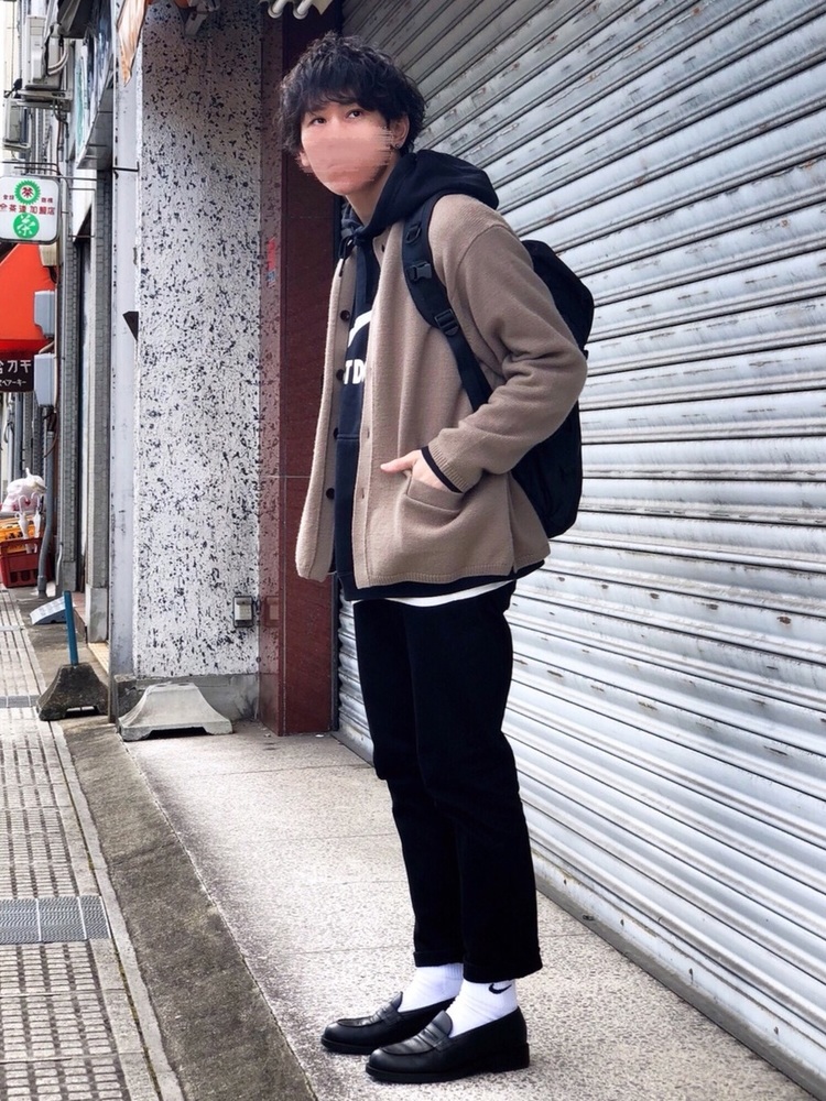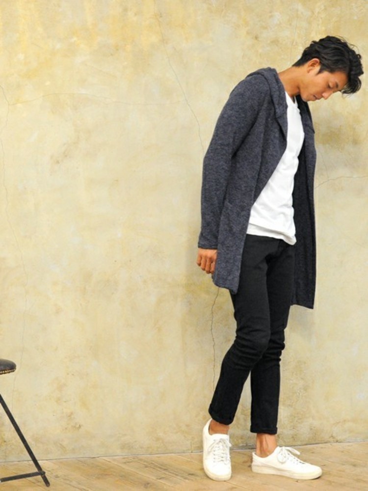 ニットカーディガンをアウターとして取り入れたメンズコーデ。パーカーでカジュアルダウンしつつも、全体のトーンをまとめることで、落ち着きのある、大人っぽい着こなしになっています。