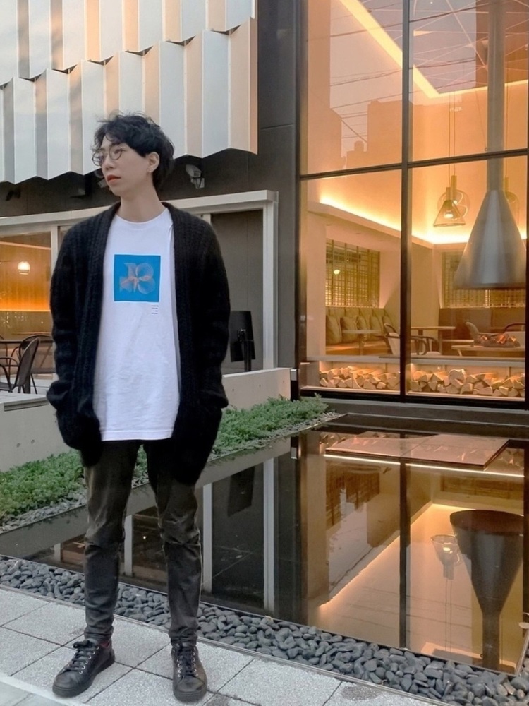 全体をモノトーンでまとめた、きれいめスタイルです。インナーのTシャツは柄物のため、ニットカーディガンとスラックスパンツはシンプルに。ニットカーディガンとシューズはブラックをセレクトし、メリハリのあるメンズコーデになっています。