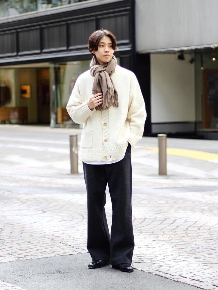 ニットカーディガンとワイドパンツを合わせたシンプルなメンズコーデです。モノトーンで組み合わせているのでメリハリがあり、すっきりとした印象に。また、マフラーで首元にボリュームを持ってくることでスタイルアップにも繋がっています。