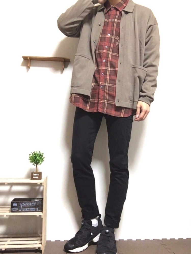 ニットカーディガンにブラックのスキニーパンツを合わせた、大人カジュアルなメンズコーデ。逆三角形のシルエットにすることで、バランスのいいスタイリングになっています。チェックシャツとニットカーディガンをレイヤードして、上品さの中にも可愛さを演出。