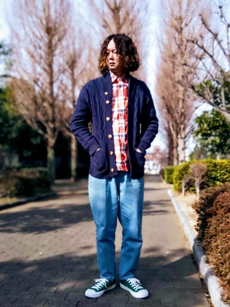 ネイビーのニットカーディガンにデニムパンツを合わせた、カジュアルなスタイリング。ブルートーンで統一し、こなれた印象を生み出しています。インナーに取り入れたチェックシャツがアクセントとなり、メリハリのある着こなしに。