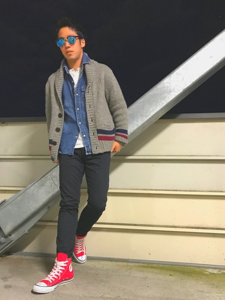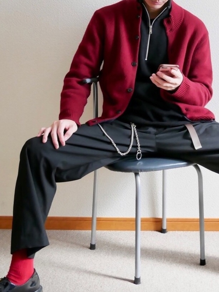 ニットカーディガンを使ったスポーツMIXコーデです。ラインの入ったニットカーディガンや赤色のスニーカーでスポーティーな印象にしつつ、シャツやパンツはきれいめなデザインに。全体的にすっきり見えるスタイリングです。