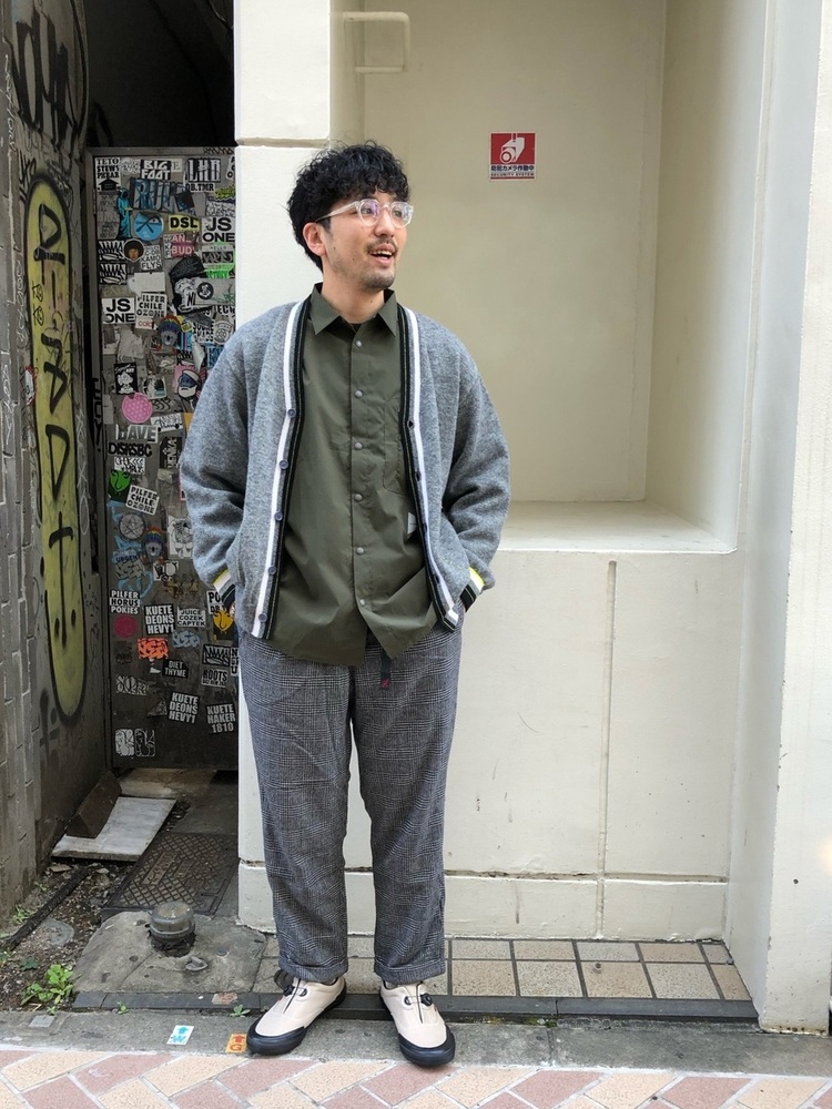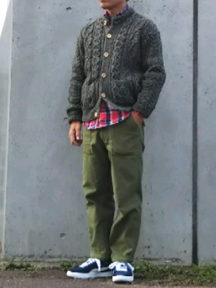 グレーのニットカーディガンに、ミリタリーパンツを合わせたストリートスタイルです。ニットカーディガンはジャストサイズをセレクトし、だらしなくならないように意識。レイヤードしたチェックシャツを少し覗かせているのもポイントです。