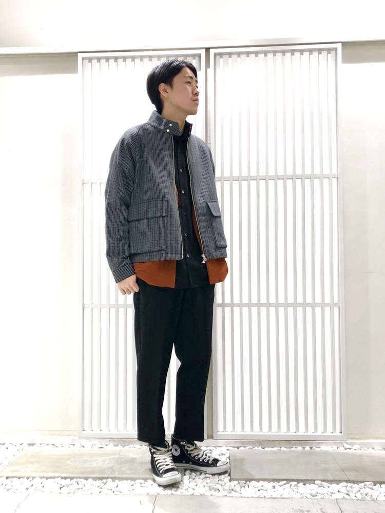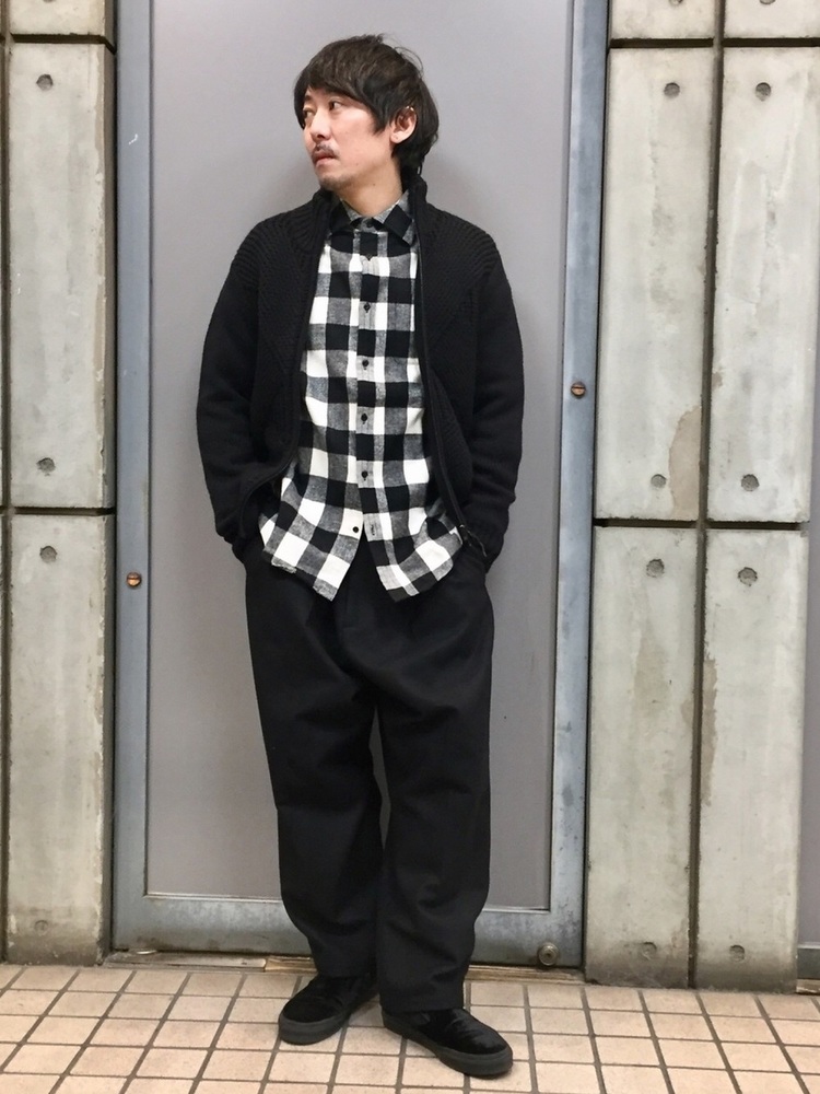 全体をブラックで統一した大人カジュアルなメンズコーデです。パンツにボリュームがある分、ニットカーディガンとチェクシャツはフィットしたサイジングに。ブラックでまとめることで、締まりのあるスタイリングになっています。
