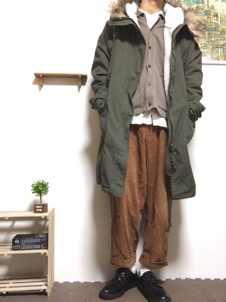 全体をアースカラーで統一した、あか抜けたメンズコーデです。冬の定番素材である、コーデュロイ素材のパンツを合わせて季節感を演出。ニットカーディガンにモッズコートを羽織ることで防寒性も確保しつつ、スタイリングをこなれた印象にアップデートしてくれています。