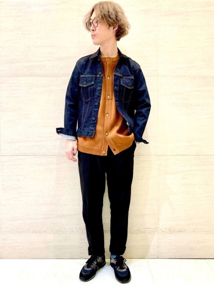 ブラウンのニットカーディガンが目を惹く、大人カジュアルなメンズコーデ。デニムジャケットにパンツという定番スタイルに、ニットカーディガンをインナーとして取り入れることで、一気にあか抜けた印象へとアップデートされています。デニムジャケットの長すぎず短すぎない丈感がちょうどよく、すっきりとした着こなしに。