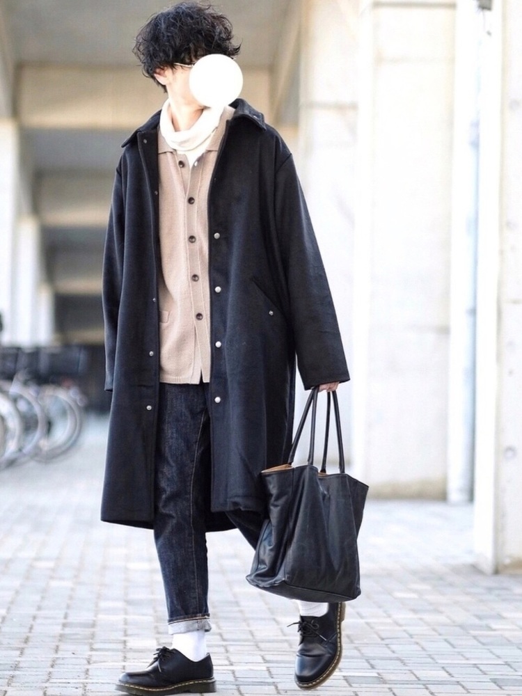 ステンカラーコートのインナーにニットカーディガンを取り入れたきれいめスタイル。ブラックでまとめたコーデにベージュのニットカーディガンを合わせることで、スタイリングに柔らかさを生み出してくれています。