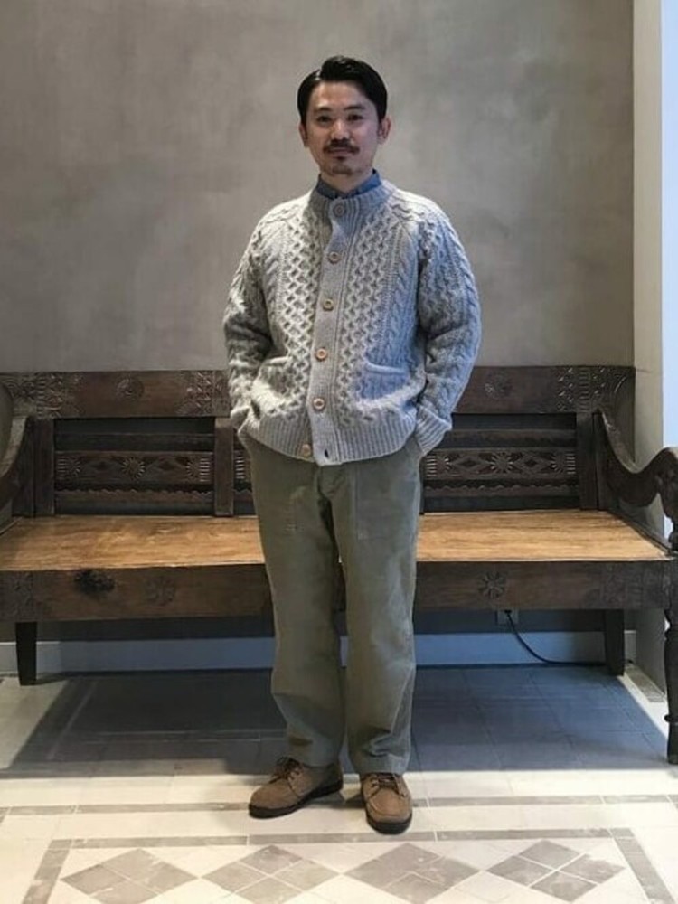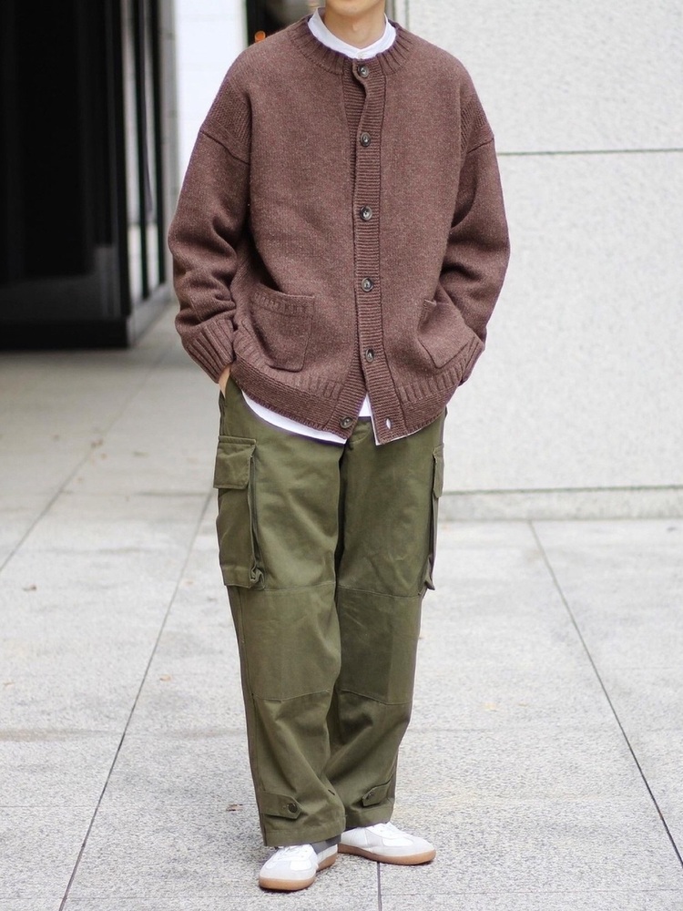 アランニットカーディガンに、ブラウンのベイカーパンツを合わせたメンズコーデです。ニットカーディガンはフィットしすぎず、程よいリラックス感があり、こなれた印象に。ベイカーパンツでカジュアルダウンしつつも、襟元から覗くシャツによって上品なスタイリングになっています。