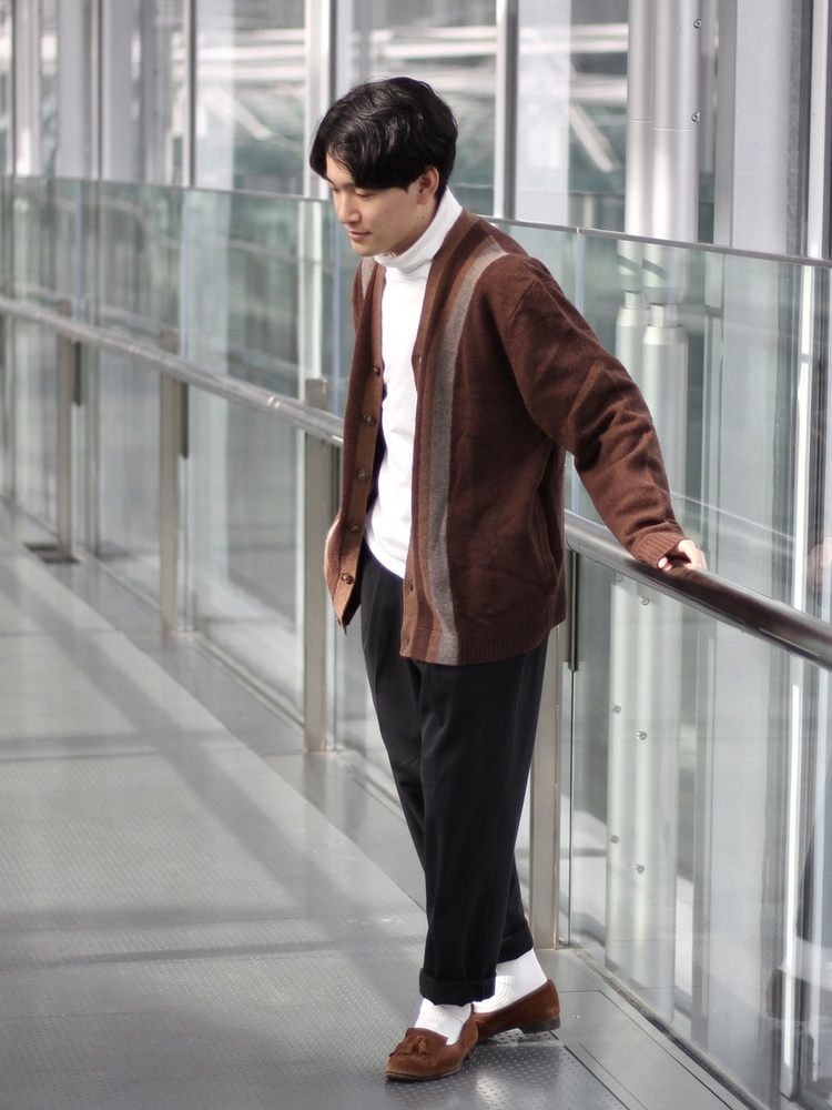 ニットカーディガンのインナーに着用しているタートルネックも、コーデにきれいめな印象を与えてくれているポイントに。冬にぴったりの大人カジュアルなメンズコーデです。