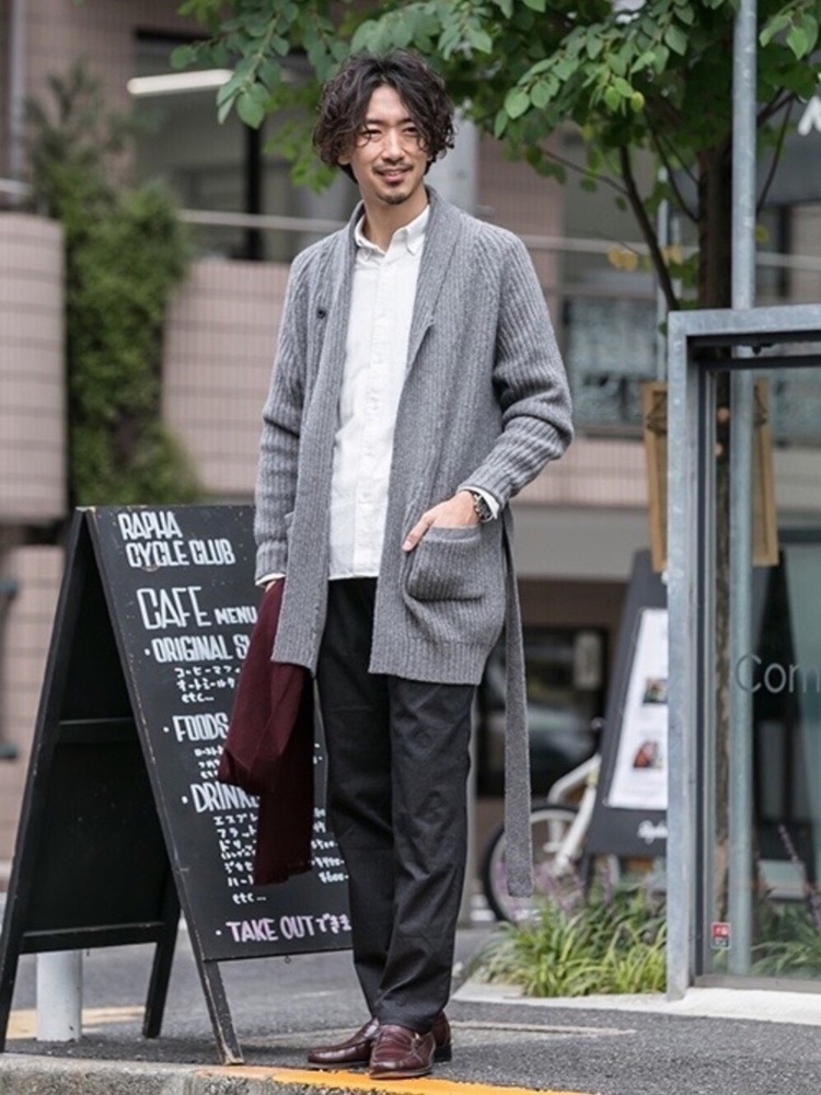 ショールカラーのニットカーディガンを使ったメンズコーデです。ニットカーディガンは程よいサイジングで、リラックス感のあるスタイルに。パンツはブラウンをセレクトして、落ち着きのある、大人っぽい着こなしになっています。秋冬のコーデにおすすめ。