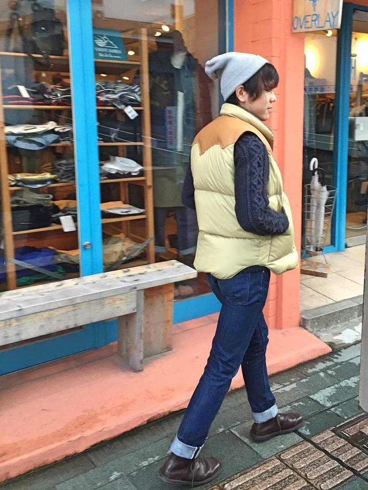 ダウンベスト のインナーとしてにとカーディガンを取り入れたメンズコーデ。デニムパンツとニットカーディガンはネイビーで統一することで、まとまった印象になっています。ダウンベストやニット帽でカジュアルダウンしつつも、足下はブーツできれいめなスタイルに。