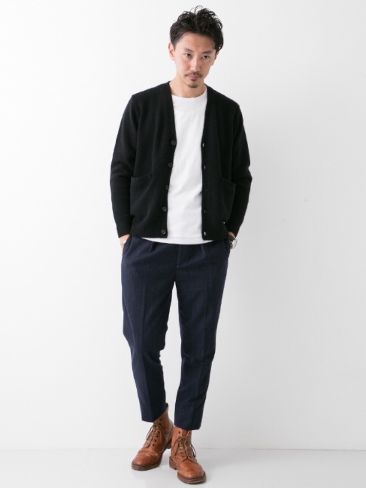 全体をシンプルにまとめたきれいめなメンズコーデです。ニットカーディガンはジャストのサイズ感で清潔感を演出。パンツはタック入りのデザインにすることで、上品な印象を生み出しています。足下はレースアップブーツで少しカジュアルダウン。大人カジュアルなスタイリングです。
