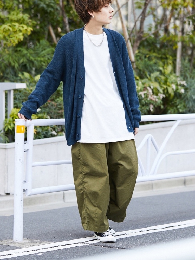 ニットカーディガンのネイビーとパンツのカーキが馴染んだ、あか抜けたメンズコーデです。ニットカーディガンとインナーのTシャツできれいめを演出しつつ、パンツはワイドシルエットのカーゴパンツをセレクト。洗練された今っぽいスタイルになっています。