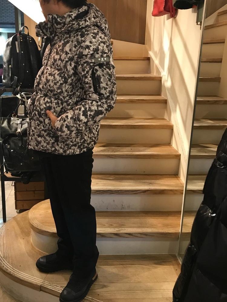柄入りダウンコート×ブラック系パンツ