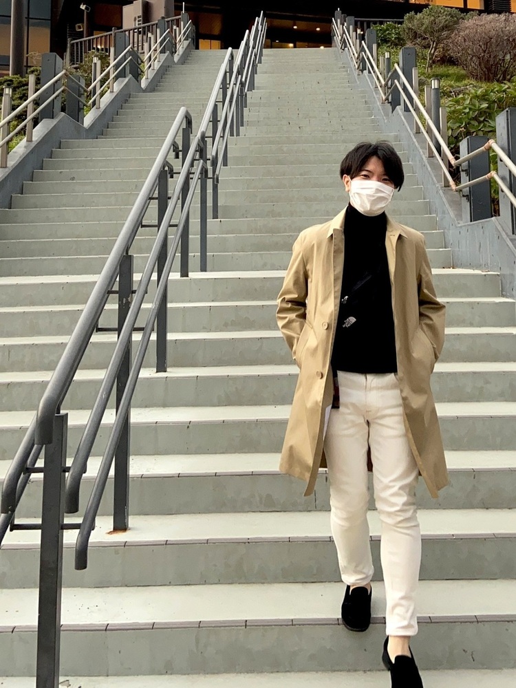 薄手の素材を使ったステンカラーコートのコーデです。スラックスの素材はキレイめな印象を与えるためビジネスシーンでもファッションを楽しみたい方におすすめします。