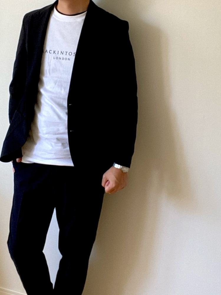 マッキントッシュフィロソフィーのセットアップをカジュアルに着こなしたコーデです。セットアップはインナーシューズの色合いを気を付けるだけで簡単にワンランク上のおしゃれを楽しめるおすすめの組み合わせですね。