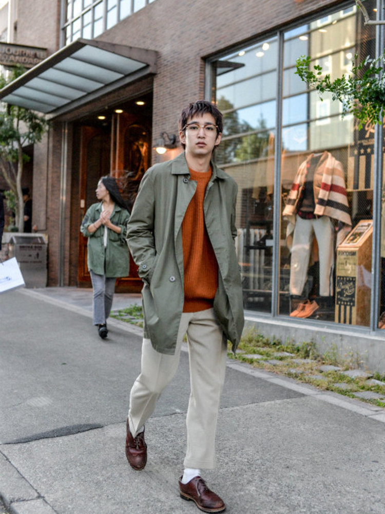 ブランドの象徴ともいえるステンカラーコートとタートルネックを合わせた紳士コーデです。薄手の素材を採用しているので春秋に映える組み合わせですね。