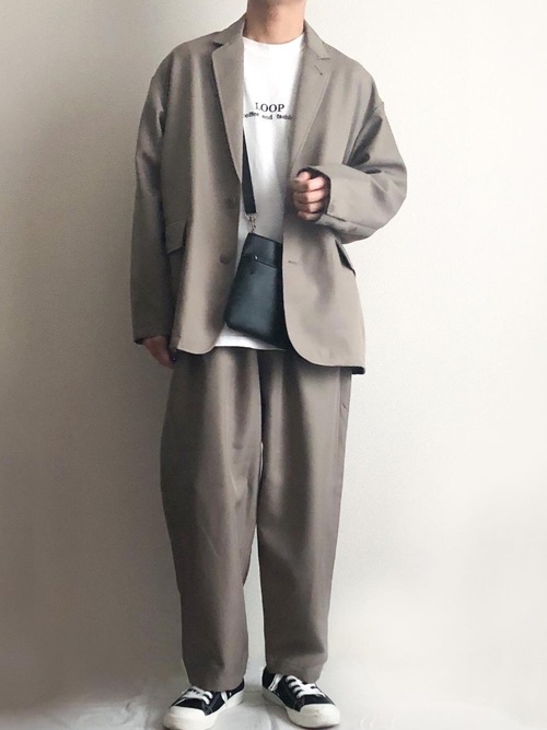 グレイッシュベージュのセットアップにフロント部分にロゴが入ったカットソーを合わせた春のメンズコーデ。セットアップのサイズを少し大きめにすることで、トレンド感のあるメンズコーデに仕上がっています。グレイッシュベージュとホワイトの相性は抜群なので、春の定番コーデとしておすすめな合わせ方です。