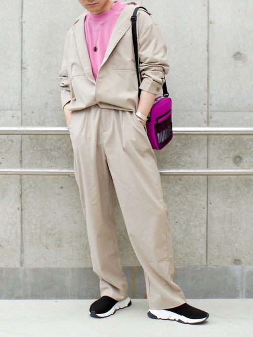 ベージュのセットアップをメインにして、ピンクのカットソーとショルダーバッグがポイントとなった着こなしです。シンプルなアイテムを合わせた着こなしですが、インナーのカットソーとショルダーバッグのピンクがポイントとなっておしゃれなコーデになっています。