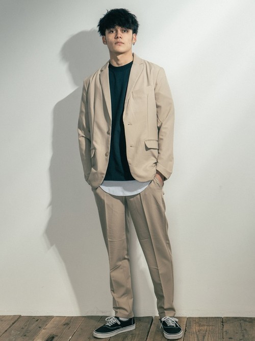 ゆったりめのセットアップをチョイスすることでイマドキな着こなしに。また、シャツをベージュにして靴をホワイトにすることで、春の明るさをプラスしています。