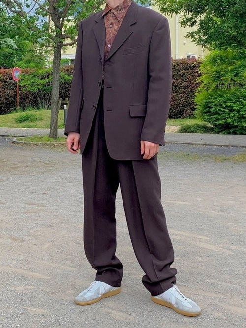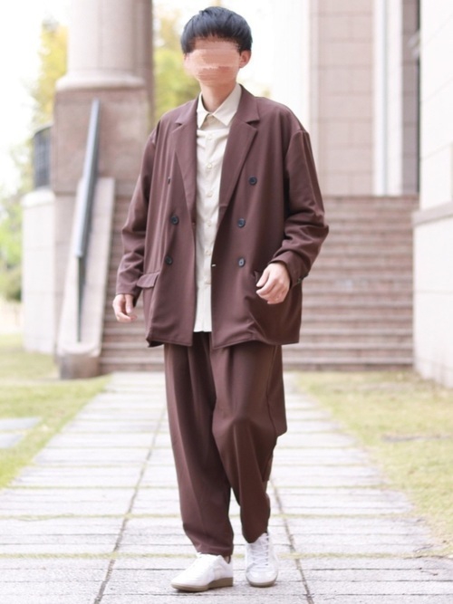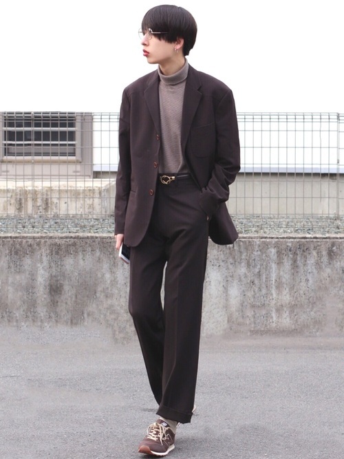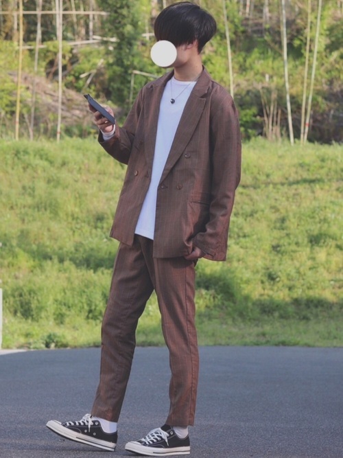 人と差をつけたい方は、画像のように赤みがかったブラウンのセットアップをコーデに取り入れてみましょう。大人っぽく落ち着いた雰囲気の春の着こなしに仕上がります。革靴を合わせると堅い印象になるので、外しアイテムとしてスニーカーを合わせるといいでしょう。