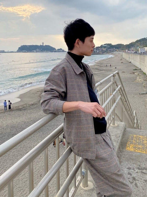 ブラウンのセットアップで落ち着いた雰囲気に仕上げたメンズコーデ。シンプルなセットアップに見えますが、さりげなくチェックの柄がデザインされているのでワンランク上の着こなしになります。