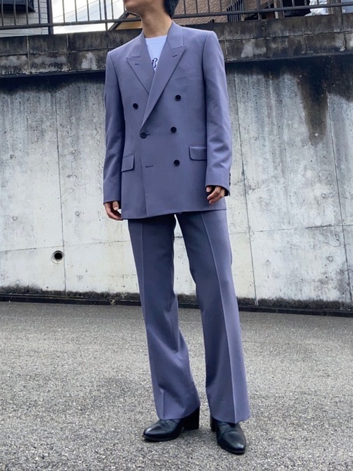 春らしいくすんだブルーのセットアップを使った春のメンズコーデです。ジャストサイズのセットアップををチョイスすることで、モードな印象に仕上がっています。また、膝から下にかけて広がるフレアのシルエットが特徴的なパンツを取り入れているので、人とは違ったコーデを楽しめる着こなしです。