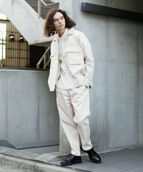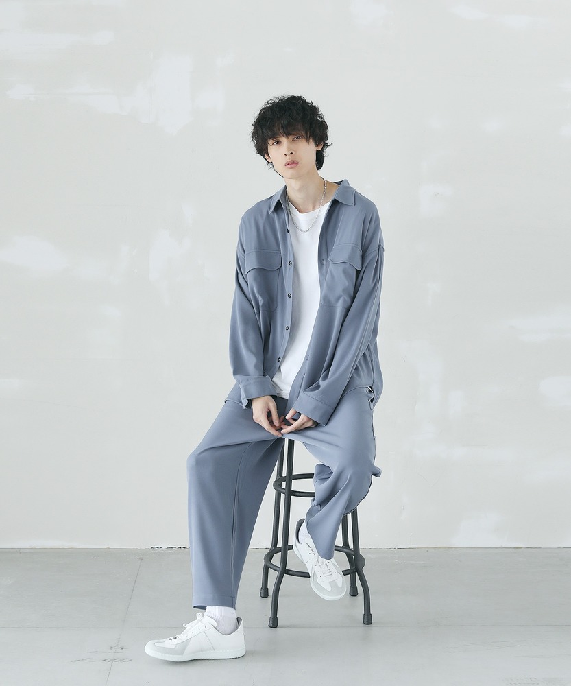 梨の皮のように細かい凸凹が特徴的な梨地織り生地が採用されたEMMA CLOTHESのセットアップ。サラっとした着心地なので、春らしいメンズコーデが楽しめます。ゆとりのあるサイズ感なので、シャツはもちろんですがニットやカットソーを合わせても上品に着こなせるでしょう。