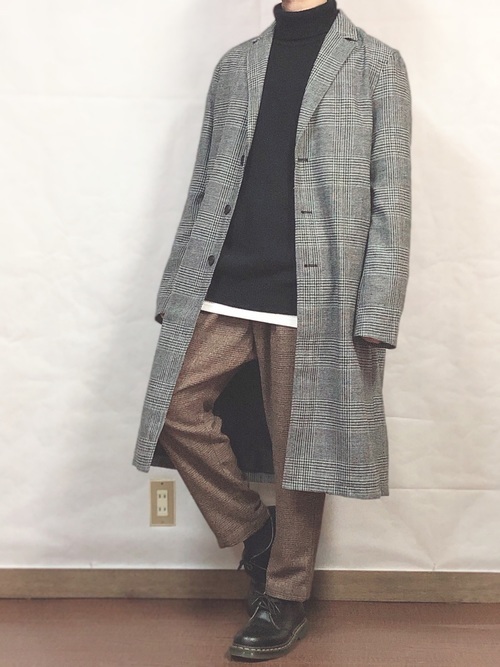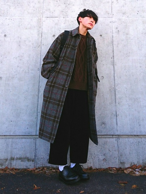 チェックシャツ×ロングコート×ワイドパンツ