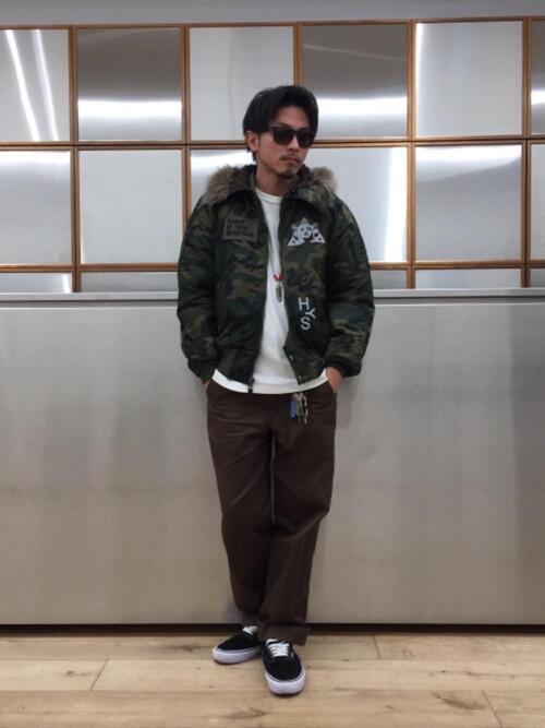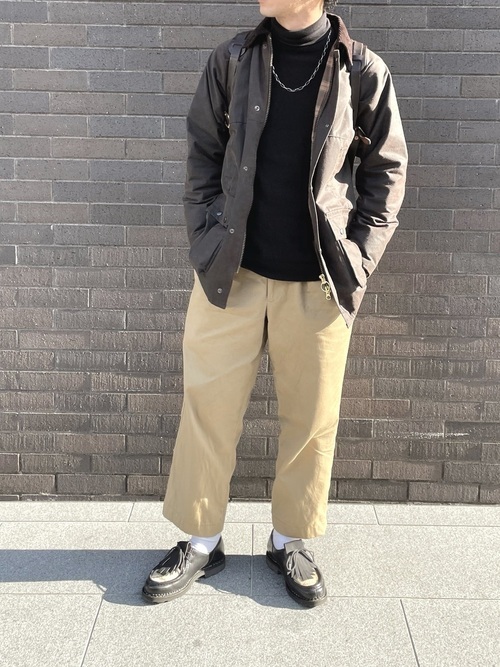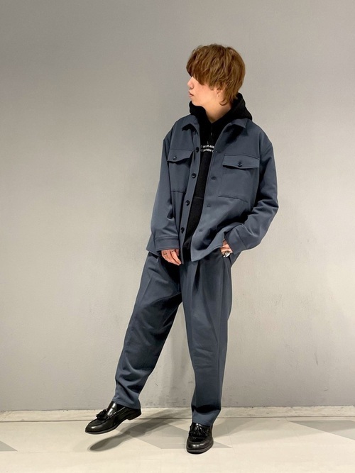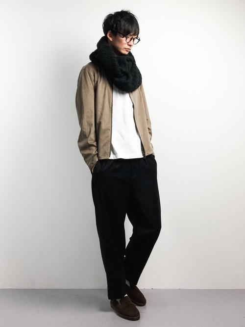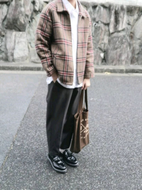 黒いパーカーをインナーにして、ブルゾンとワイドパンツをセットアップにして着こなしています。靴はキレイめな印象を付加させる黒いローファーです。ワイドパンツがテーパードシルエットなのでローファーとの相性も良く、足元がすっきりして見えます。