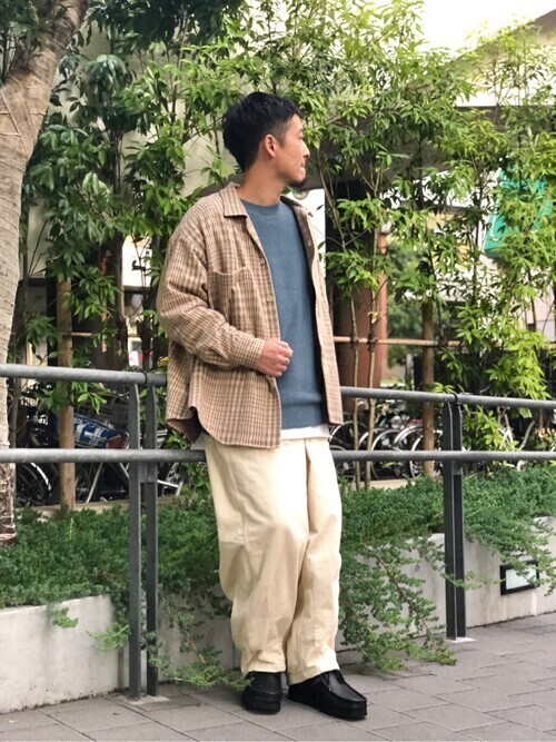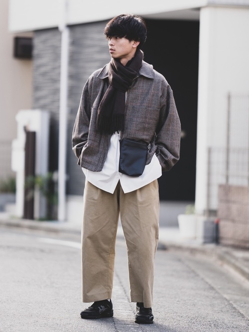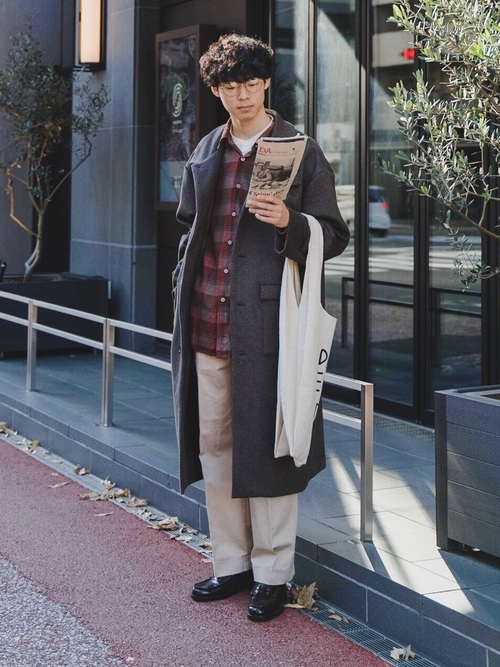 トップスはスタンドカラーシャツにチェックシャツを重ねたレイヤードスタイルにしています。アウターはロングコートでローファーと合わせているのでキレイめな印象です。ベージュのワイドパンツからは爽やかさも感じられます。