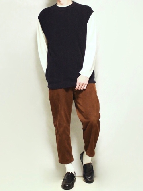 トップスをカットソーとニットでレイヤードして、大人っぽく仕上げたメンズコーデです。落ち着いた色みも大人らしさがあって好印象を与えます。また、暖色を使っているところも冬らしさを出すポイントです。