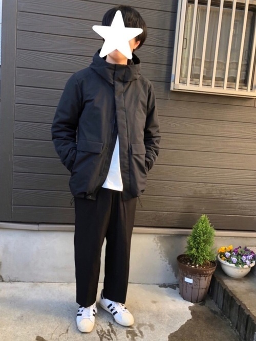 黒インナー×ダウンジャケット×ワイドパンツ