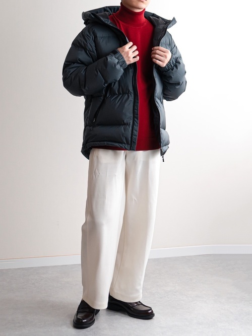 ニット×ダウンジャケット×ワイドパンツ