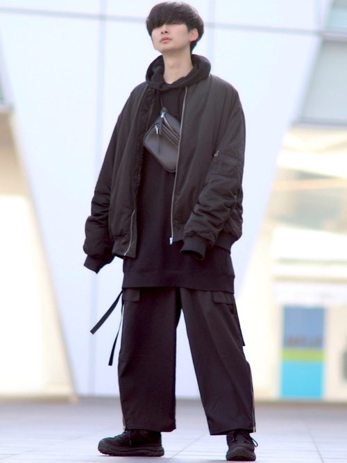 トップスから靴まで、全身黒で統一しています。アウターのブルゾンもゆったりしたサイズ感を選んだオーバーサイズコーデです。インナーはレディースのフーディワンピースを使っているので、丈が長めになっています。全体を黒で統一すると男らしさも加味されますね。