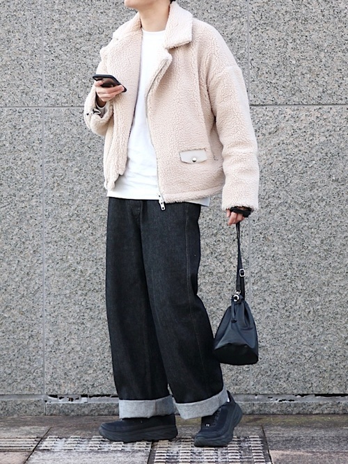 アウターにボア素材のライダースジャケットを使って、冬らしいメンズコーデです。ワイドパンツはブラック系のデニムで、足元をロールアップにして適度な抜け感を出しています。ベージュとデニムの落ち着いた色味が好印象です。