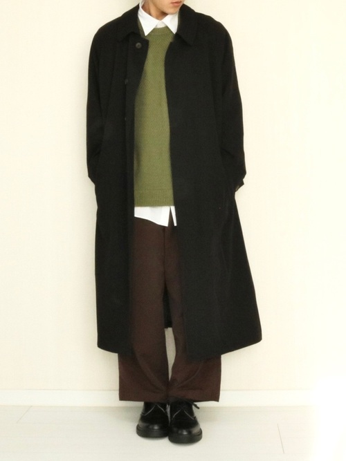 白シャツにグリーン系のベストを重ね、アウターには丈の長いロングコートを合わせています。ワイドパンツはブラウンと、全体的に落ち着いた色みにまとめているので大人な雰囲気です。足元も絶妙な丈を選んで革靴なので、大人な印象を底上げしています。