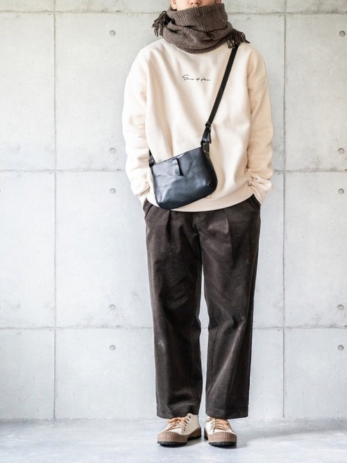 スウェットとワイドパンツでリラックス感ある着こなしです。ワイドパンツはコーデュロイ素材なので冬らしさも感じられます。マフラーはパンツと同系色にして、全体的に落ち着きのある色みです。