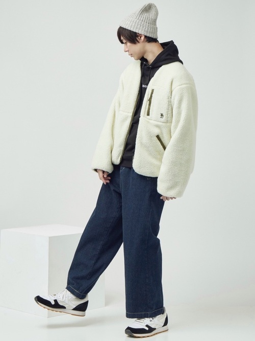 パーカー×ボアブルゾン×デニムワイドパンツ
