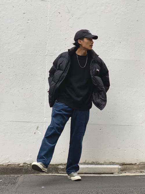 黒いトップスと青のパンツにキャップで、ストリートカジュアルにまとめています。アウターのダウンジャケットも黒で、ワイルドな雰囲気です。シンプルな長めのネックレスもワイルドな印象を底上げしています。