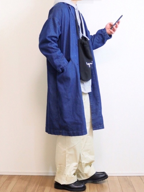 インナーとワイドパンツを淡い色で合わせて、アウターのデニムコートでアクセントを加えた着こなしです。デニムの青が加わることで引き締め効果もあり、ロング丈なのでスマートな印象も加味されています。