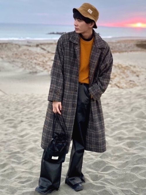 人気のロングコートに、人気のチェック柄を組み合わせたおしゃれなメンズコーデです。少し丈を長めに設定することでロングコートを使ったコーデがより際立ちます。ハット系の帽子との組み合わせもおすすめポイントです。