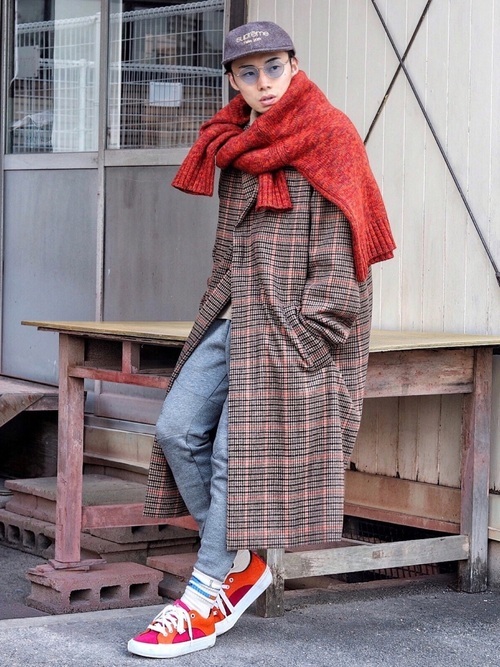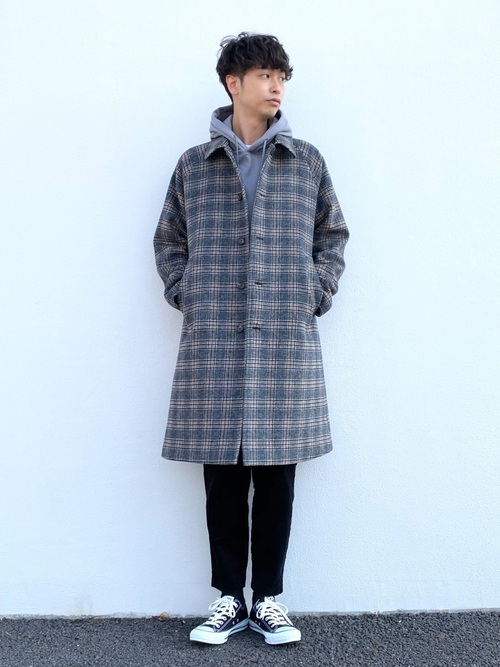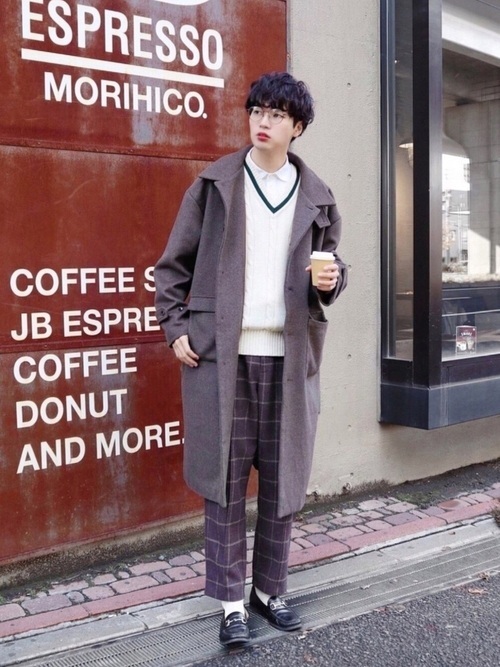 ベースのカラーはグレーですが、チェック柄のような多彩な色が入ったラブレスのロングコートは、若い男性にぜひ選んで欲しいアイテムです。ちょうど膝丈の長さにセットされており、初めてのロングコートでもイメージ通りのシルエットを作り出すことができるでしょう。