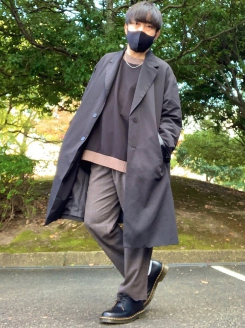 ロングコートとワイドパンツとを組み合わせたメンズコーデです。股下を少し長めにすることで、パンツもよりワイドに見せることができ、流行り感が強まります。カラーバランスもとてもいいです。